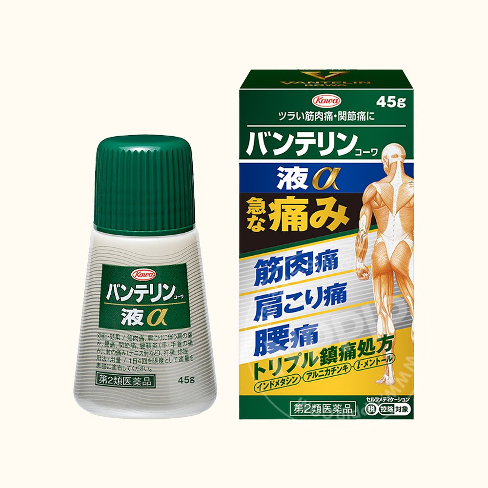 반테린 코와액 α는 근육과 관절의 통증을 완화하는 트리플 진통 성분(인도 메타신, l-멘톨, 아르니카 팅크)이 함유된 국소 침투제입니다.