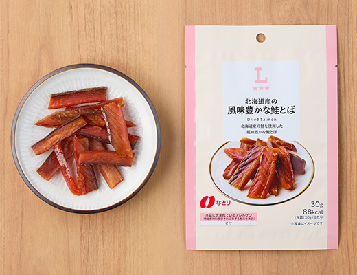 홋카이도산 연어를 사용해 깊은 풍미를 살린 연어포 간식입니다.