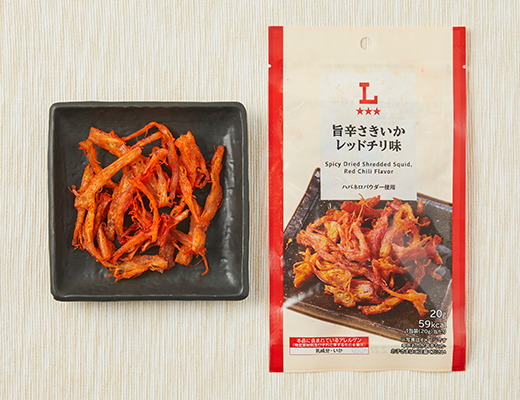 매콤한 레드칠리 풍미를 더한 찢은 오징어 간식입니다.