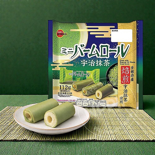 둥글게 말아 완성한 미니 사이즈의 롤케이크를 진한 향기의 구운 교토산 우지 말차 크림으로 감쌌습니다.